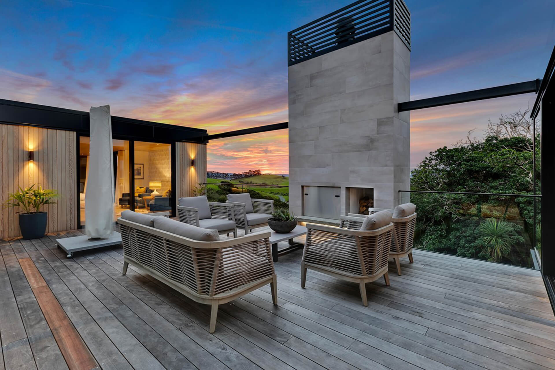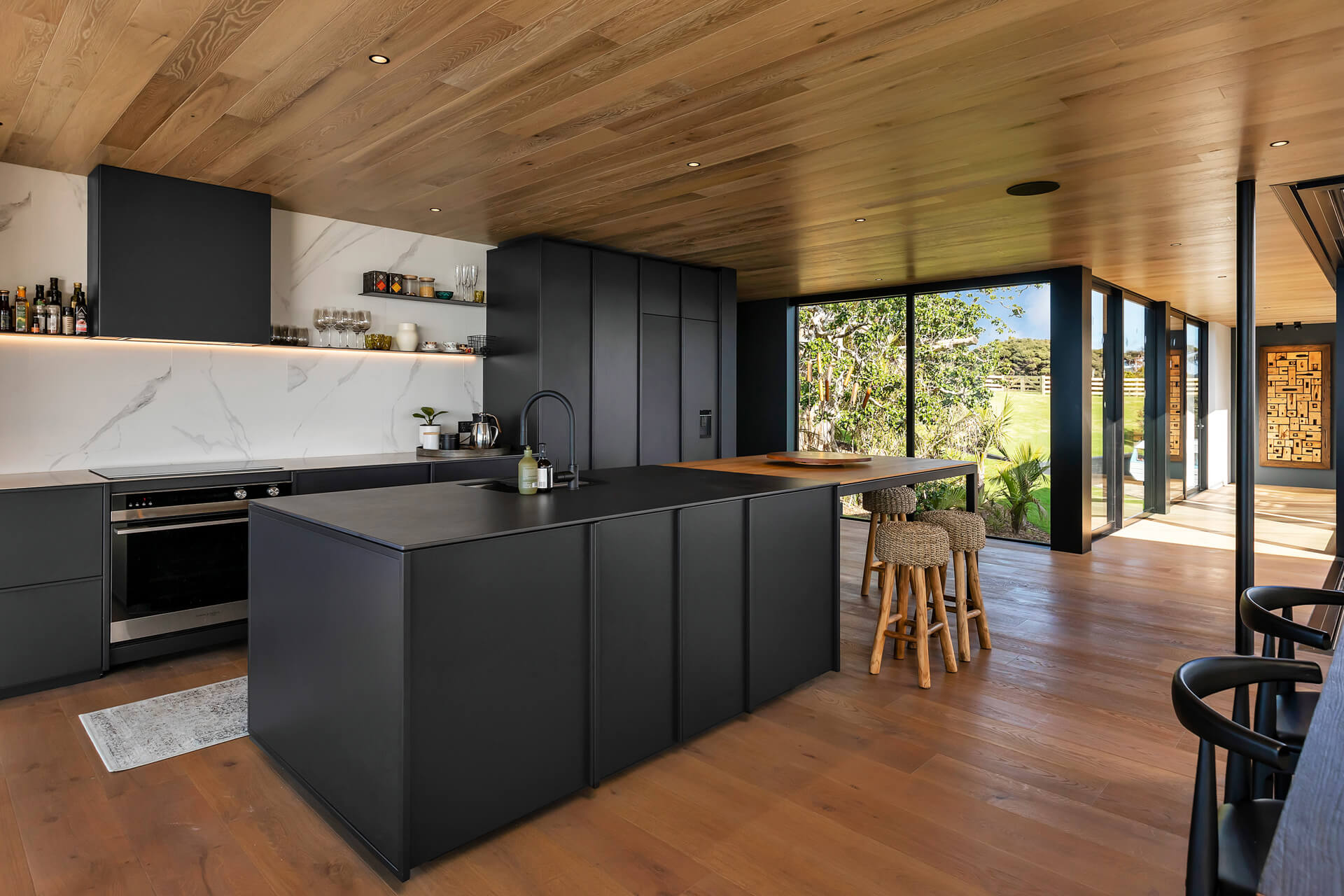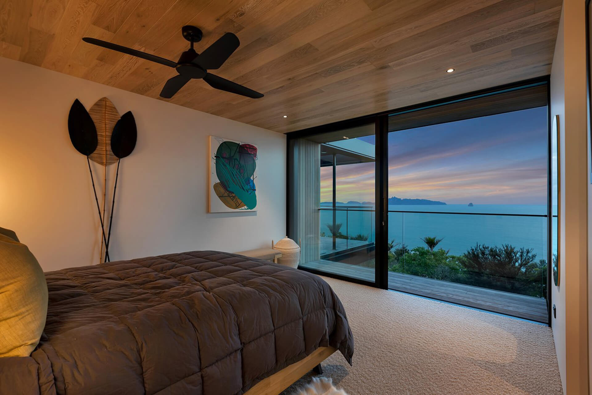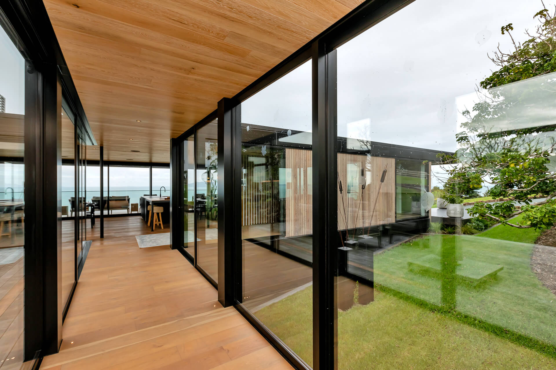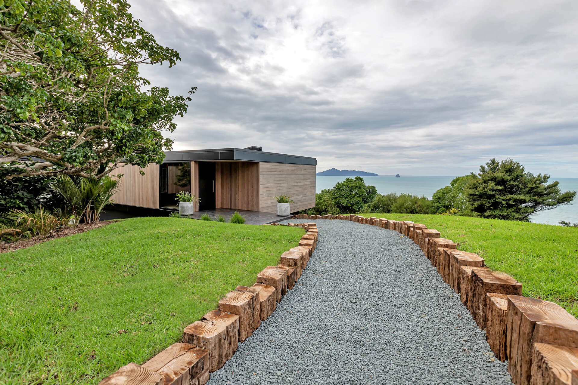Nestled in Bream Tail Farm, Mangawhai Heads, Puriri House is a mid-century modern home framed by a grand old Puriri tree. Positioned on a cliffside, it captures sweeping ocean and rural views with sharp angles, clean lines, and cantilevered forms, softened by organic landscaping that blends seamlessly with its coastal setting.