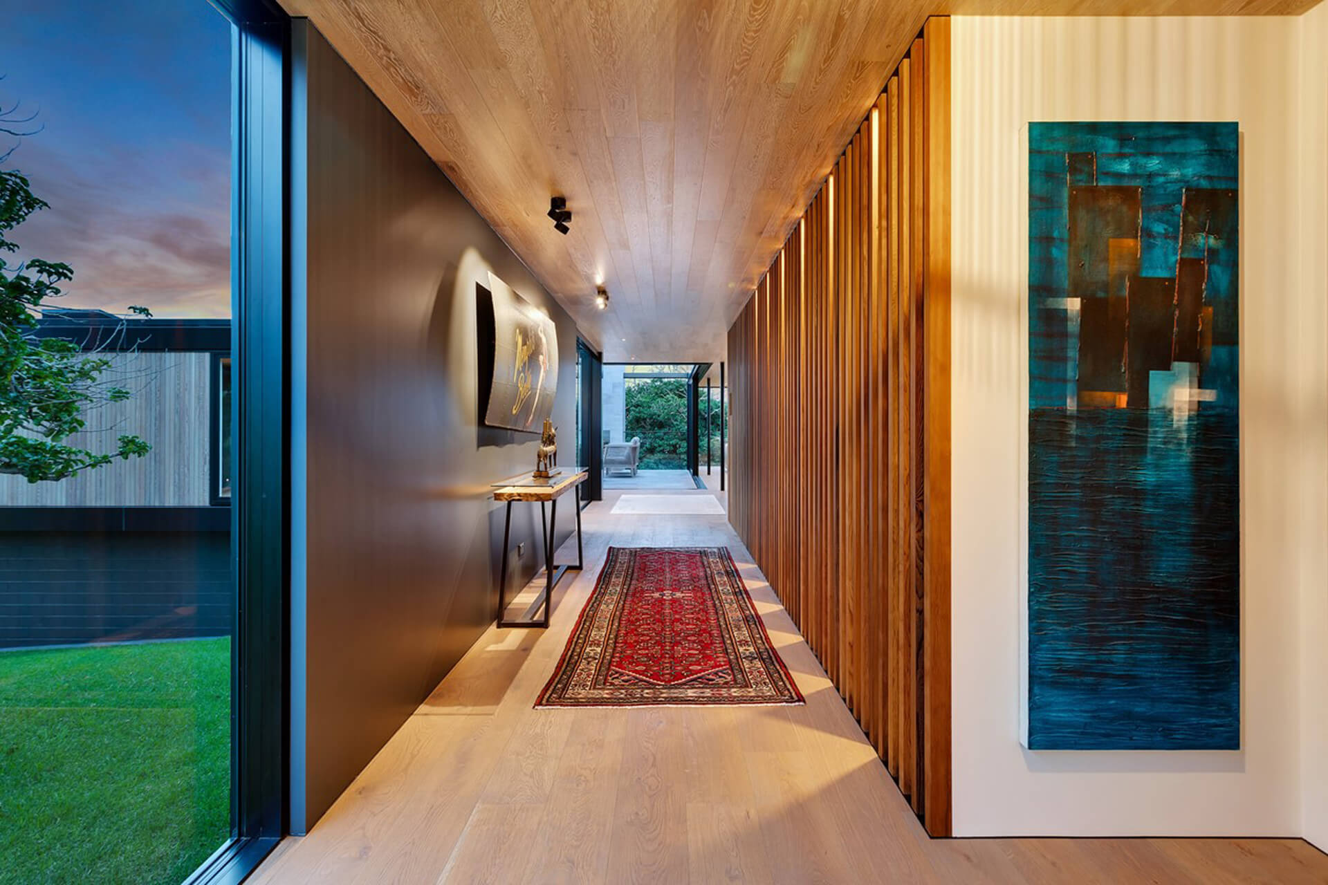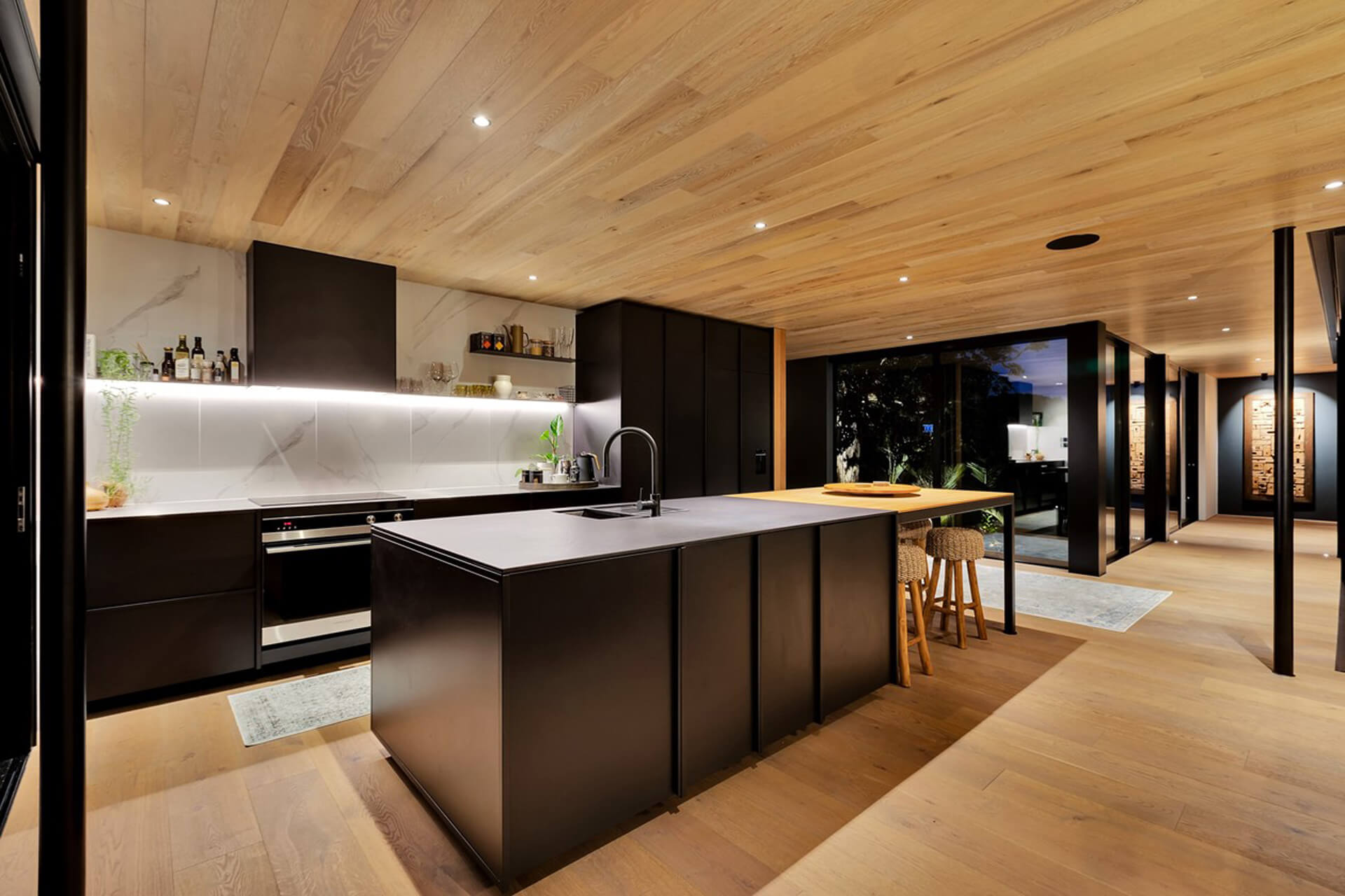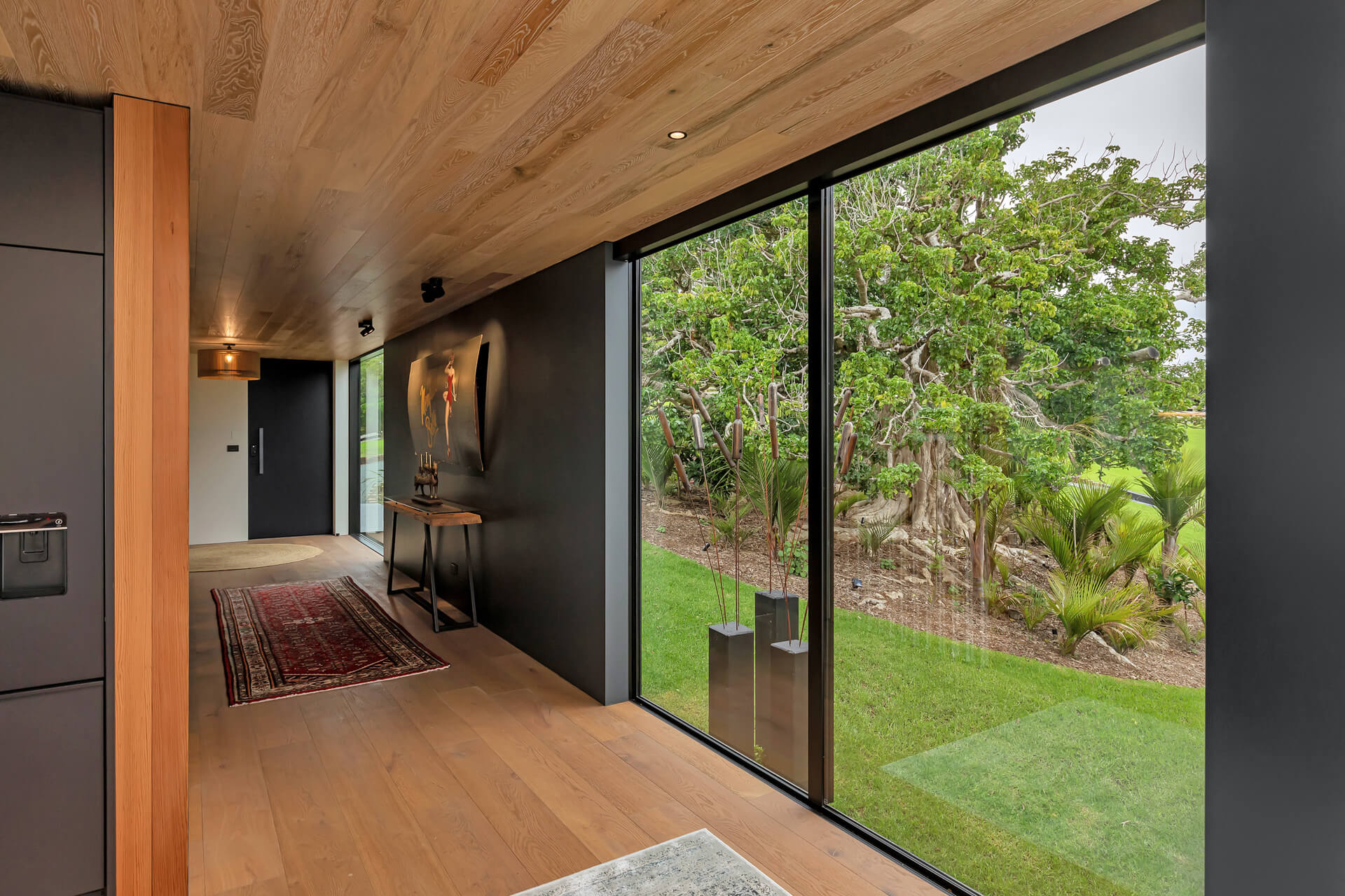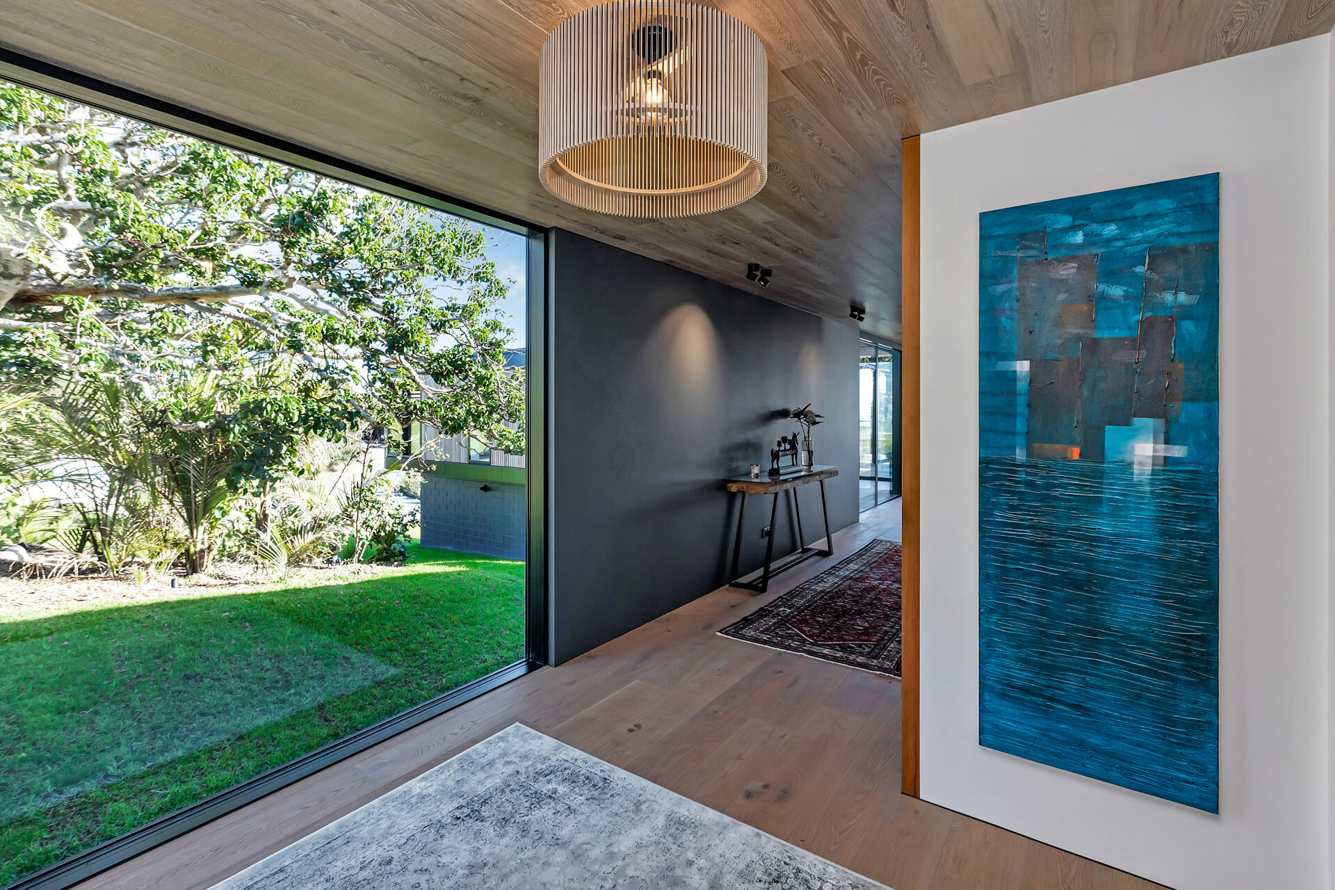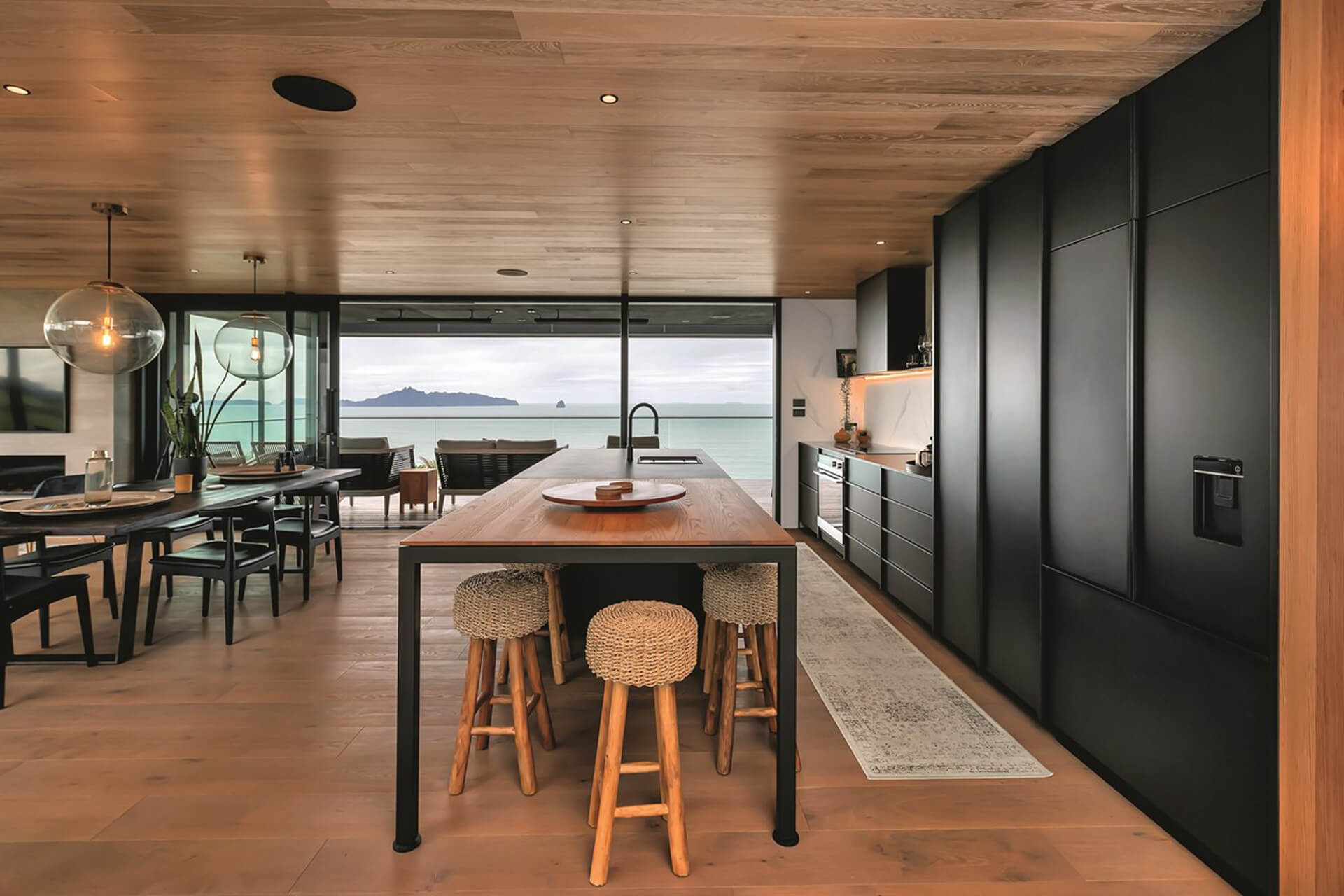 Nestled in Bream Tail Farm, Mangawhai Heads, Puriri House is a mid-century modern home framed by a grand old Puriri tree. Positioned on a cliffside, it captures sweeping ocean and rural views with sharp angles, clean lines, and cantilevered forms, softened by organic landscaping that blends seamlessly with its coastal setting.