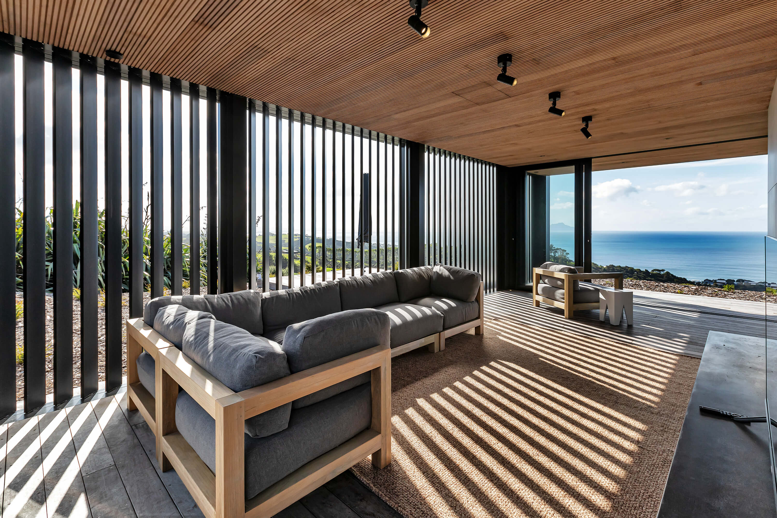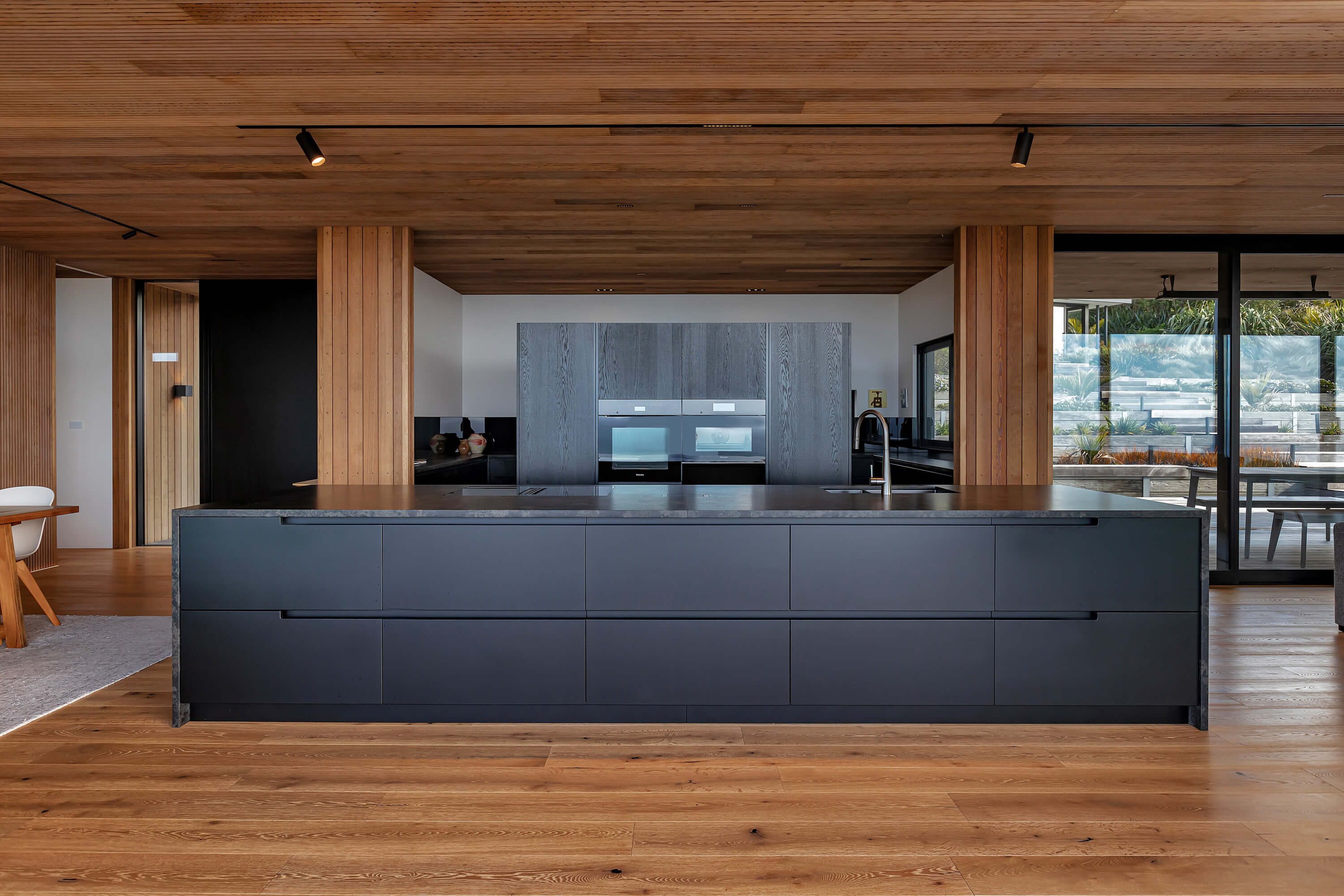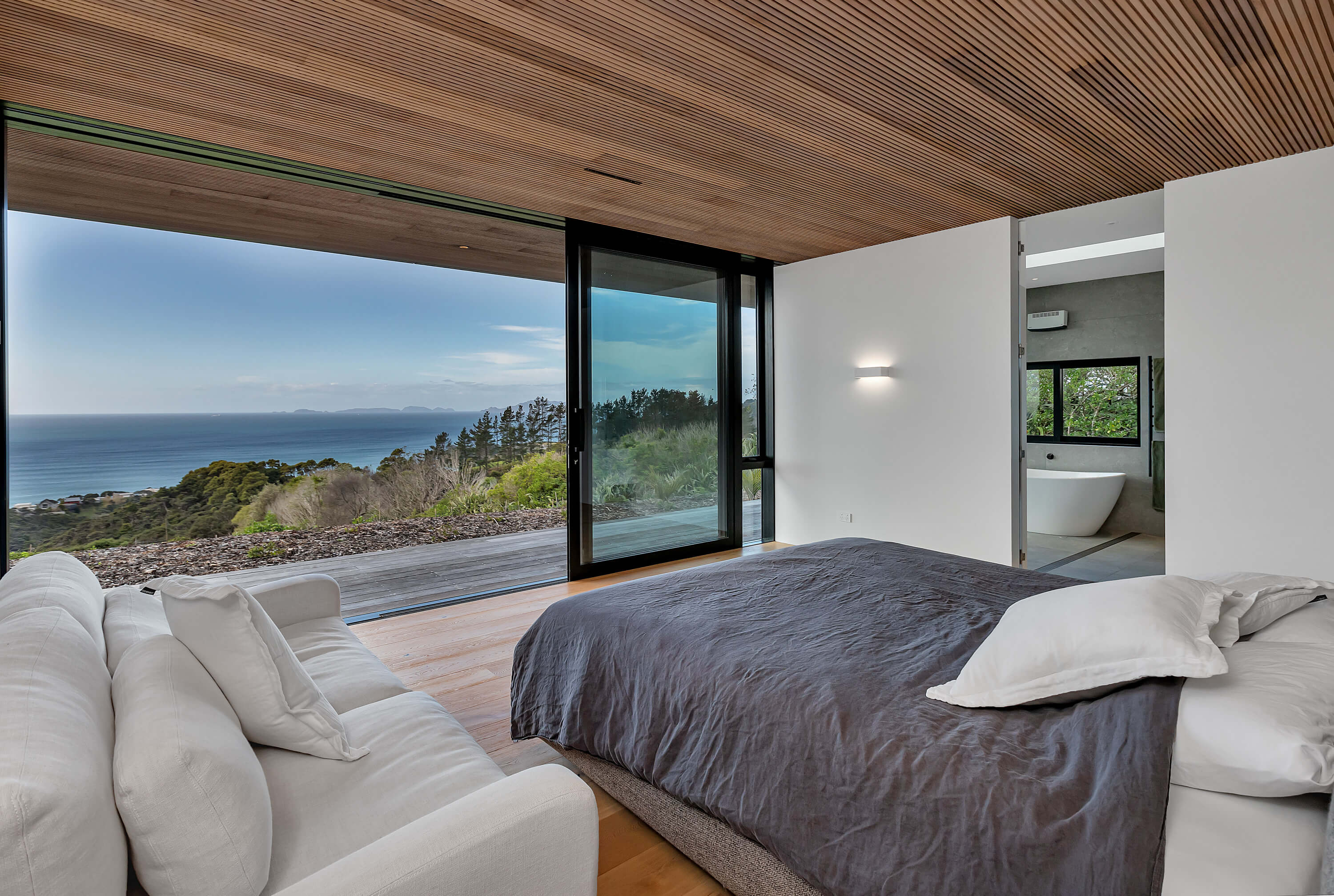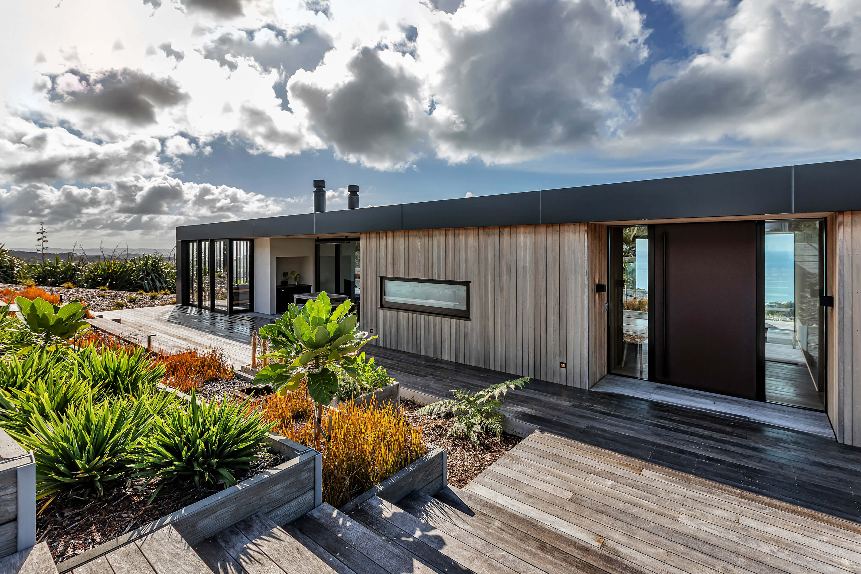 Located at Langs Beach, Crescent House emerges through a hedged driveway to reveal dramatic coastal views over a rugged coastline. Designed with minimal elements, it features large glass planes that open fully to the environment, cedar ceilings and walls, and a restrained material palette, creating a serene, Scandinavian-inspired retreat that prioritises the surrounding landscape.