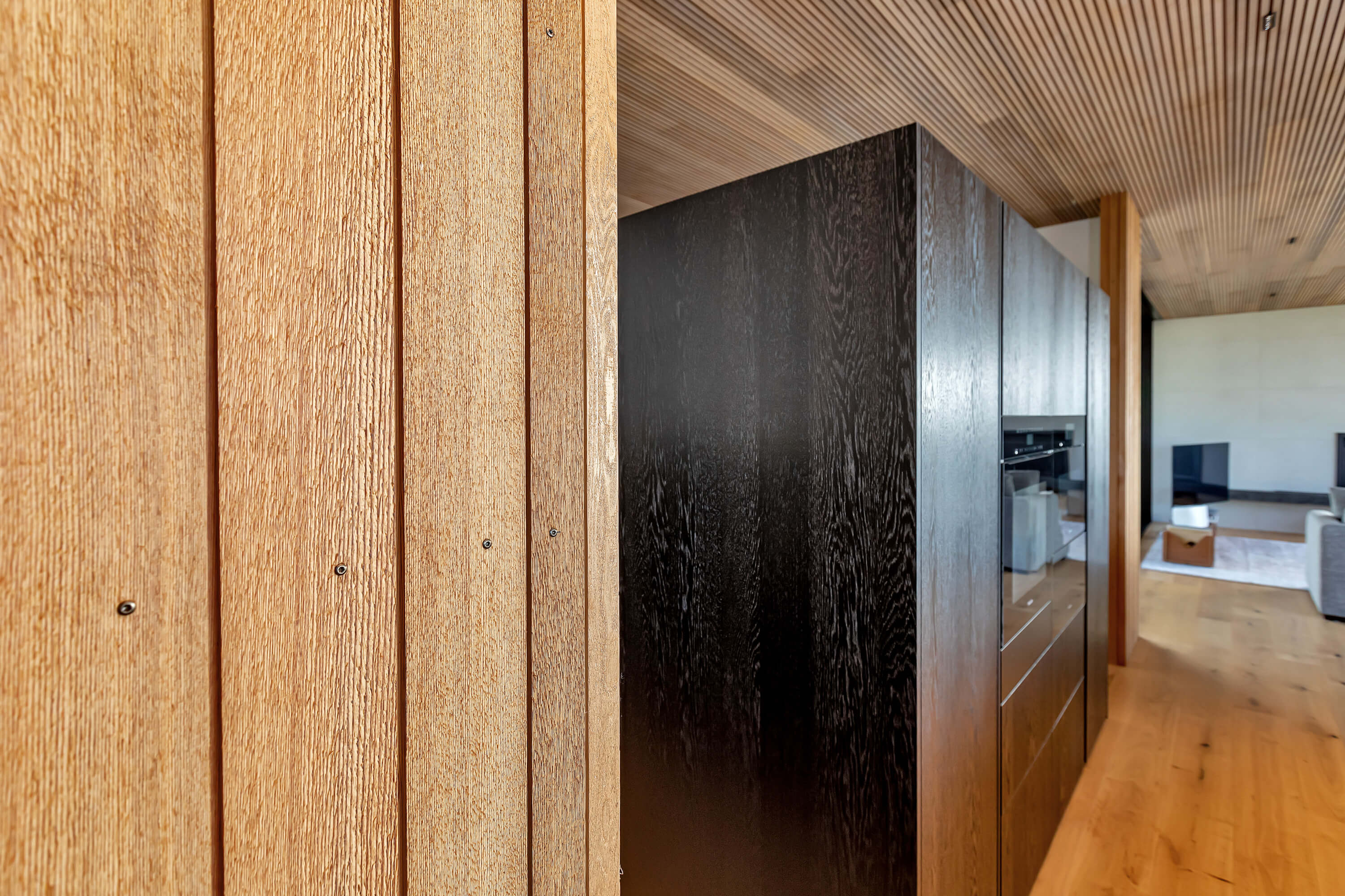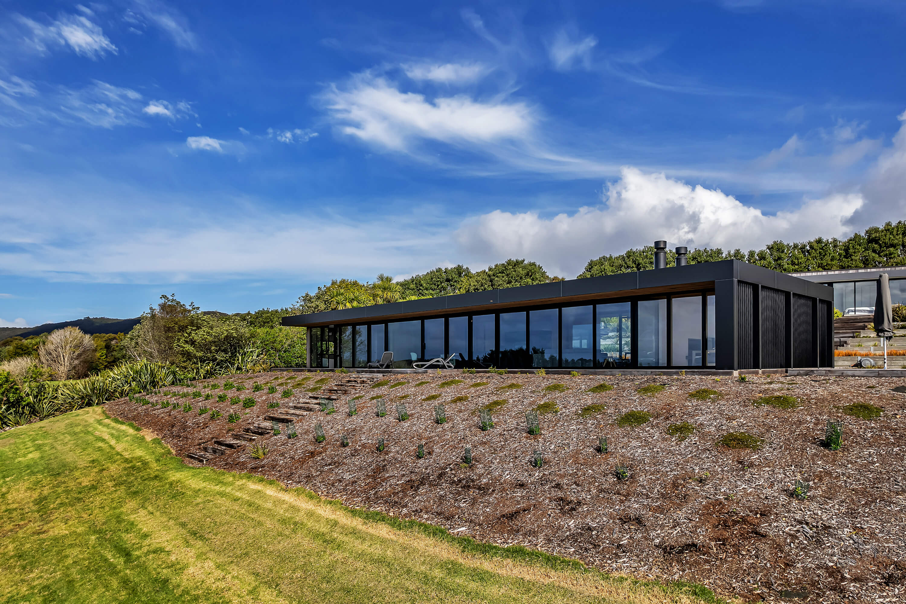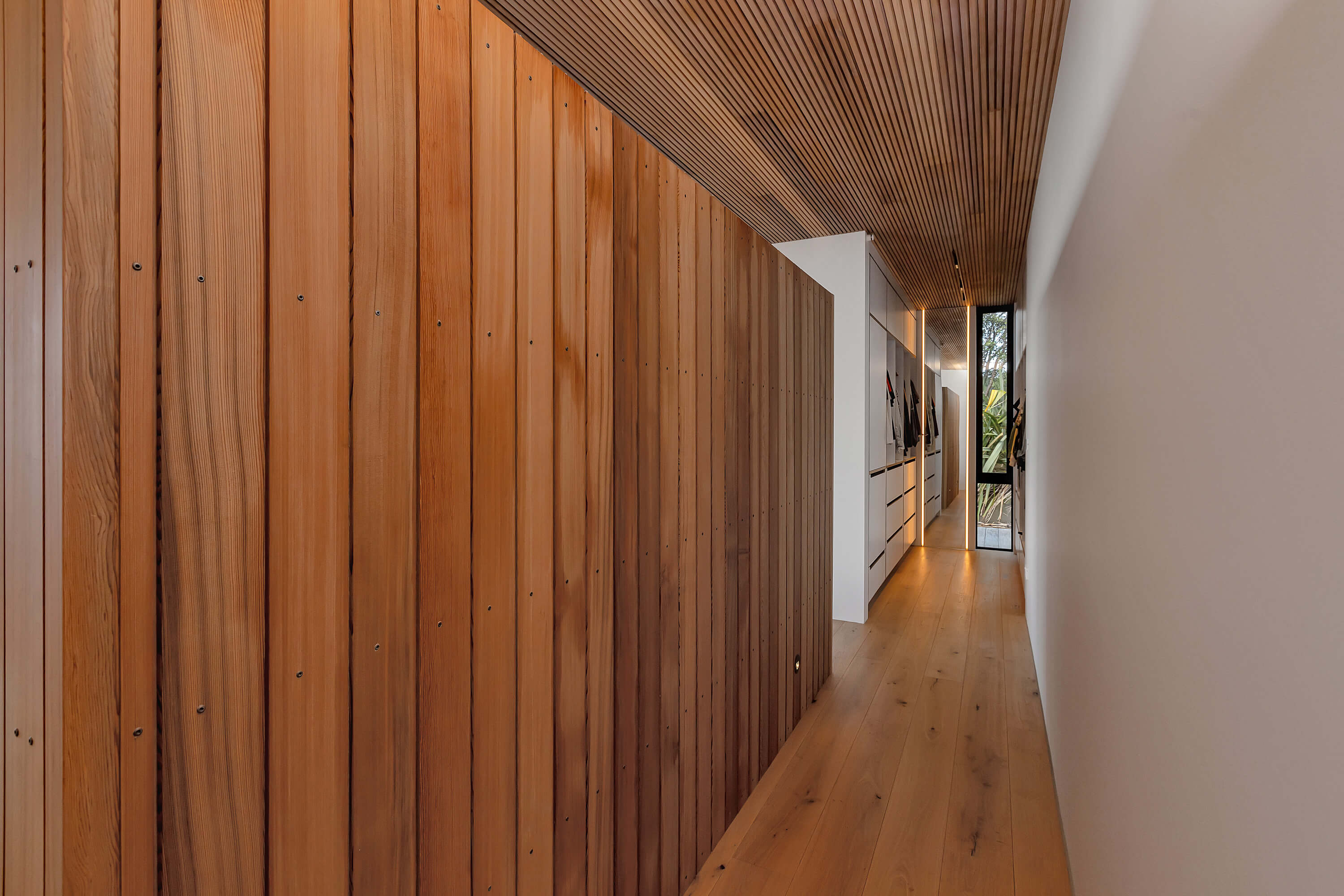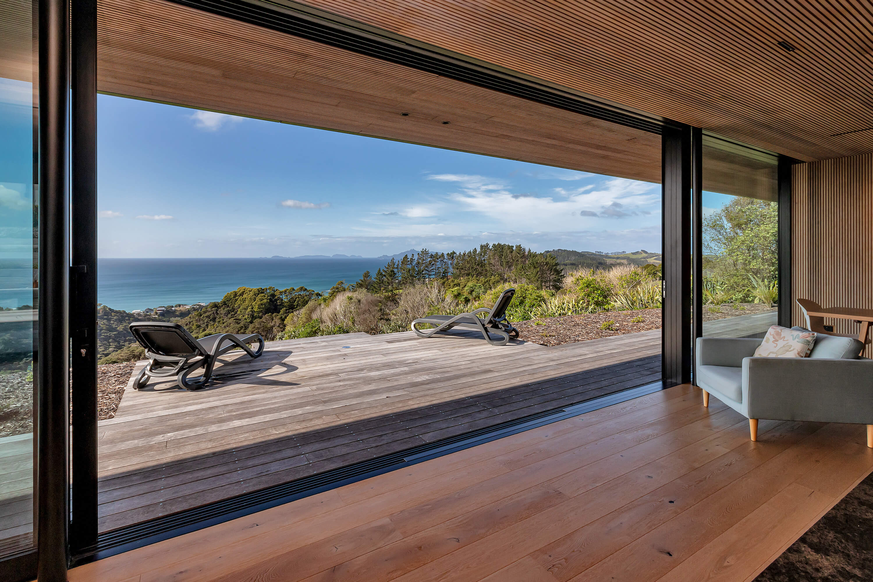 Located at Langs Beach, Crescent House emerges through a hedged driveway to reveal dramatic coastal views over a rugged coastline. Designed with minimal elements, it features large glass planes that open fully to the environment, cedar ceilings and walls, and a restrained material palette, creating a serene, Scandinavian-inspired retreat that prioritises the surrounding landscape.