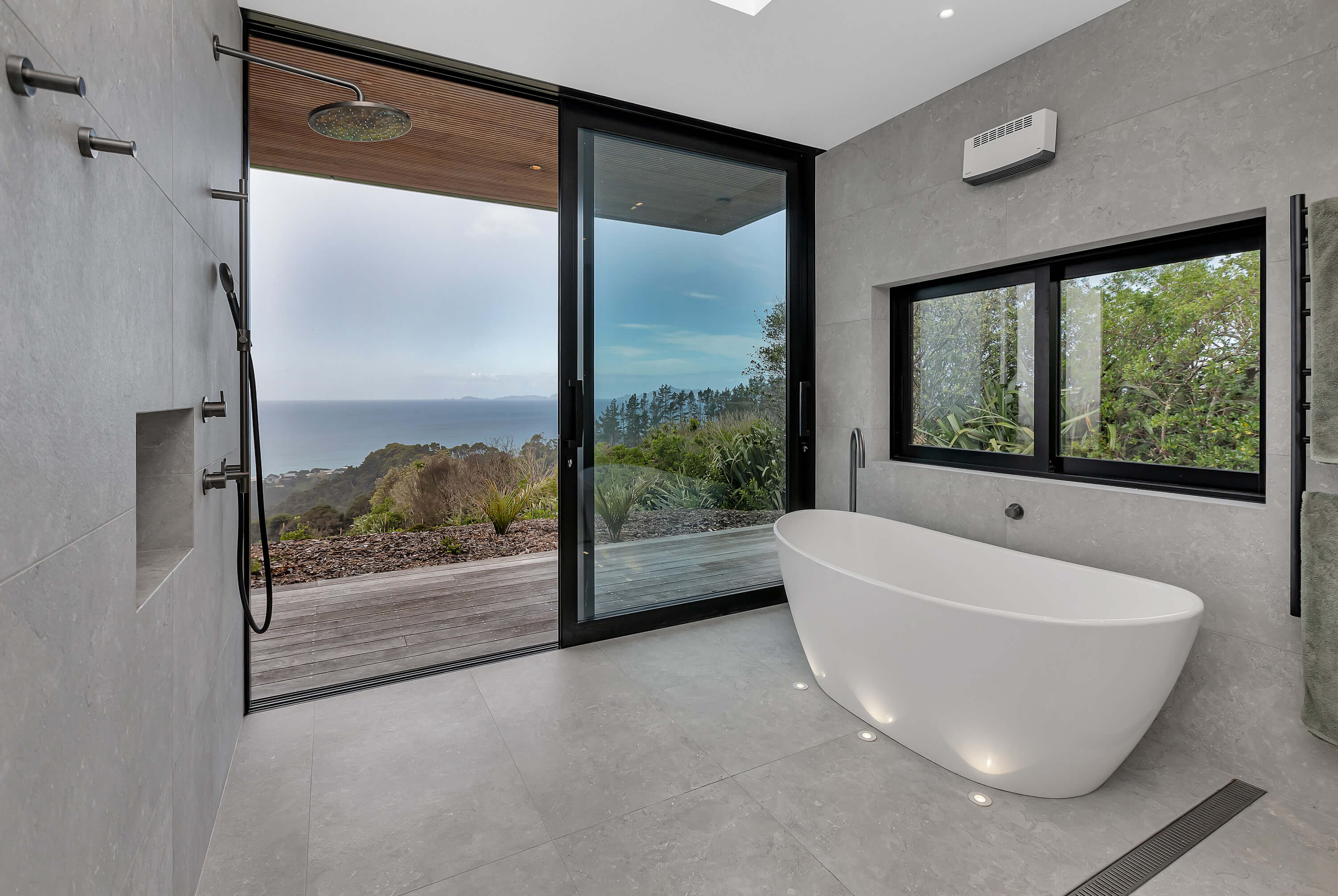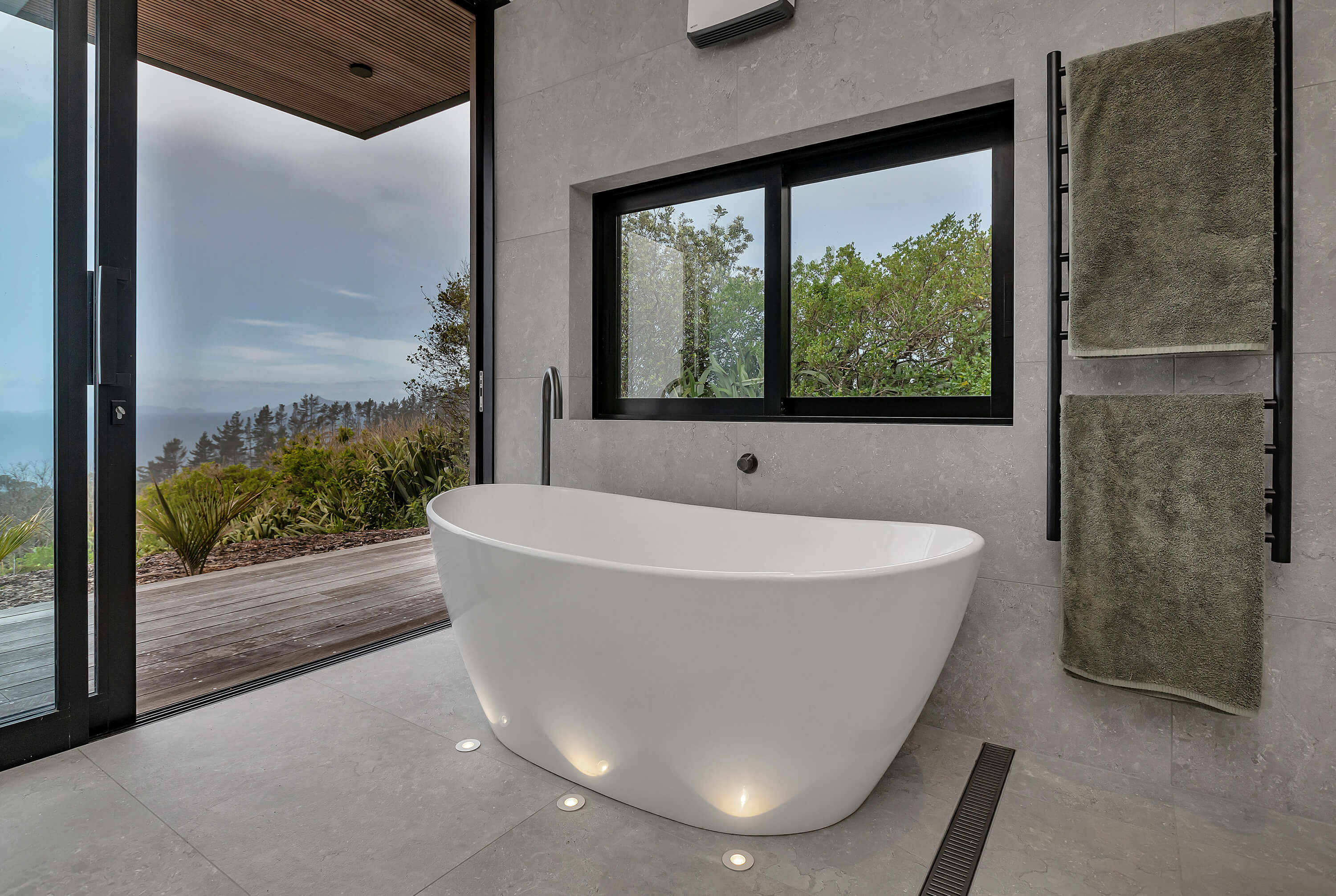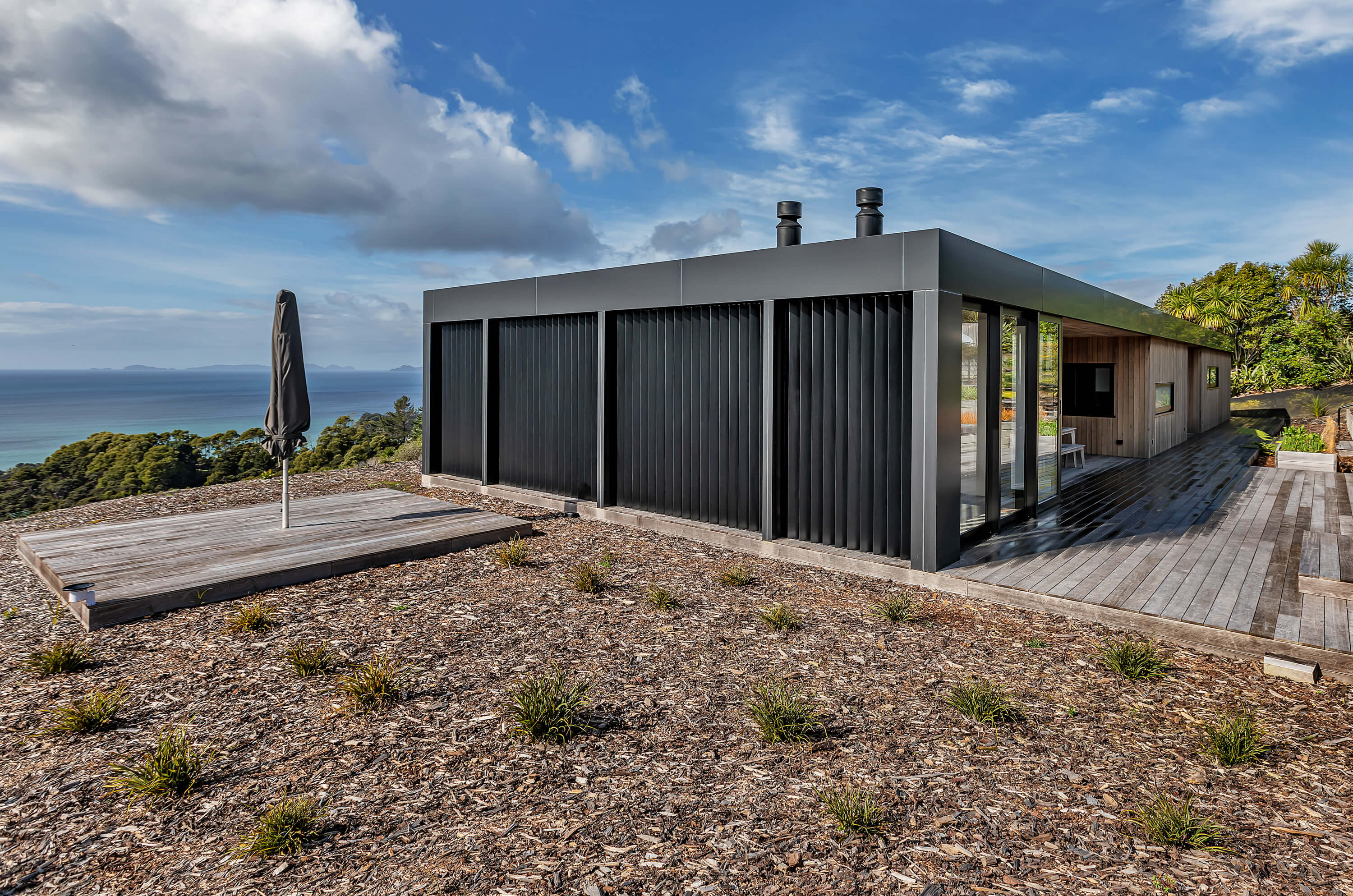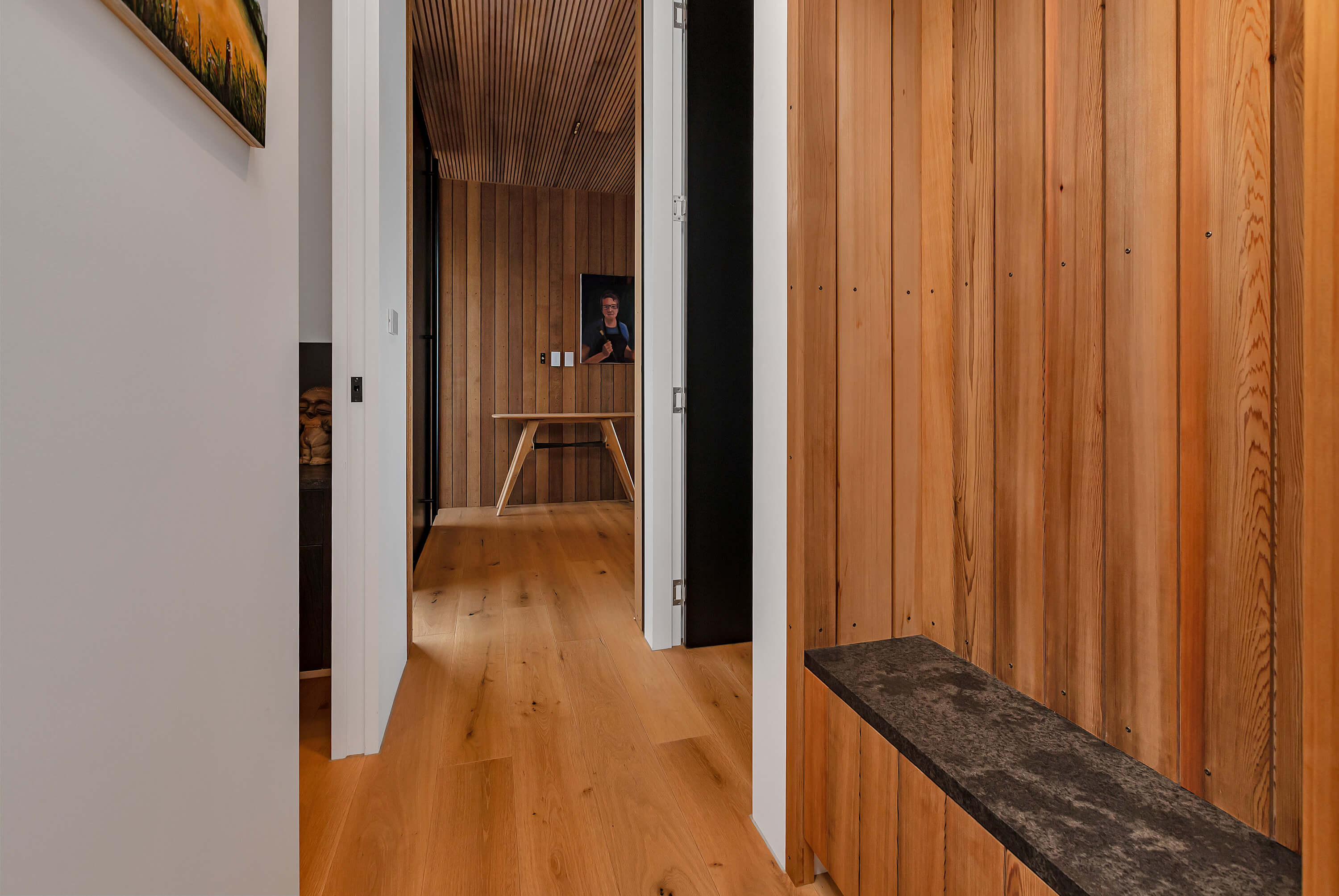 Located at Langs Beach, Crescent House emerges through a hedged driveway to reveal dramatic coastal views over a rugged coastline. Designed with minimal elements, it features large glass planes that open fully to the environment, cedar ceilings and walls, and a restrained material palette, creating a serene, Scandinavian-inspired retreat that prioritises the surrounding landscape.